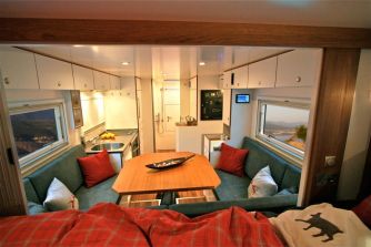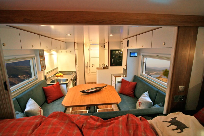 Action Mobil ATACAMA L family – Geländegängige Villa auf Rädern02.03.2010 Auf dem Doppelkabinen-Fahrgestell des MAN TGM 18.330 BB 4x4 baut das jüngste Projekt des österreichischen Spezialisten für hochgeländegängige Expeditionsmobile: Das Action Mobil „ATACAMA L family“. Dabei ist der Name Prinzip. Im Führerhaus reisen bis zu sieben Personen bequem und vor allem auch sicher, während sich im Inneren des 5,9 Meter langen Aufbaus eine luxuriöse Villa auf Rädern erstreckt. Wie bei allen Modellen von Action Mobil ist auch beim ATACAMA L family jedes Detail durchdacht – bis hin zur grauen Lackierung. Stellt diese doch sicher, dass die Fahrzeugkonturen in den Abend- und Nachtstunden möglichst unauffällig sind. Auch bei der Liftvorrichtung zur Aufnahme einer Enduro am Heck hat sich Action Mobil eine besondere Lösung ausgedacht: Die hydraulisch angetriebene Edelstahl-Konstruktion hebt das Zweirad so hoch, dass der hintere Böschungswinkel nicht beeinträchtigt wird – und auch Langfingern wird ihre „Arbeit“ erschwert. Die Wohnkabine des ATACAMA L family besteht aus einer 61 mm starken rahmenlosen GFK-Sandwichbauweise, die Verbindung mit dem Fahrerhaus stellt eine 101 cm hohe verschließbare Türe her. Der Aufbau ruht auf einem Zwischenrahmen mit Pendellagern, so dass sich das MAN-Fahrgestell auch in schwerem Gelände ausreichend verwinden kann. Hinter den freundlich hellen und dank Resopalbeschichtung pflegeleichten Möbeloberflächen versteckt sich raffinierte Technik: Eine ausschwenkbare Kaffeemaschine ist ebenso an Bord wie ein ausfahrbarer Fernseher mit Satelliten-Empfänger.
